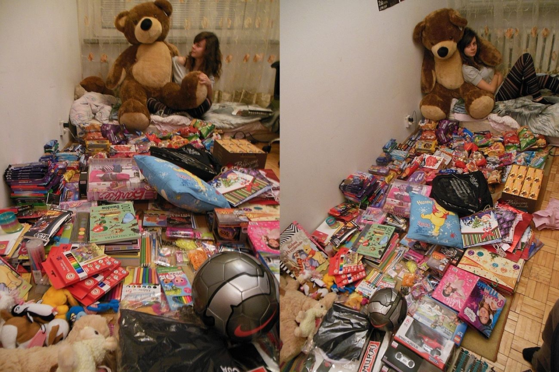 Przelewy, zaangażowanie, pytania. Zapraszanie do wydarzenia znajomych, rozpowszechnianie akcji, namawianie kolegów z grupy na studiach, współlokatorów. W ciągu niecałego miesiąca codziennie umawiałam się z kilkoma osobami chętnymi coś przekazać, zbierałam od Was paczki ze słodyczami, książki, ubrania, zabawki, zdalnie sterowane autka. Doczołgiwałam się do domu obładowana reklamówkami. Dostałam nawet misia większego ode mnie. W końcu rzeczy przestały się mieścić w pokoju. A na koniec Małgosia z jej kołem naukowym z Politechniki Krakowskiej wybudowała olbrzymi domek dla lalek.